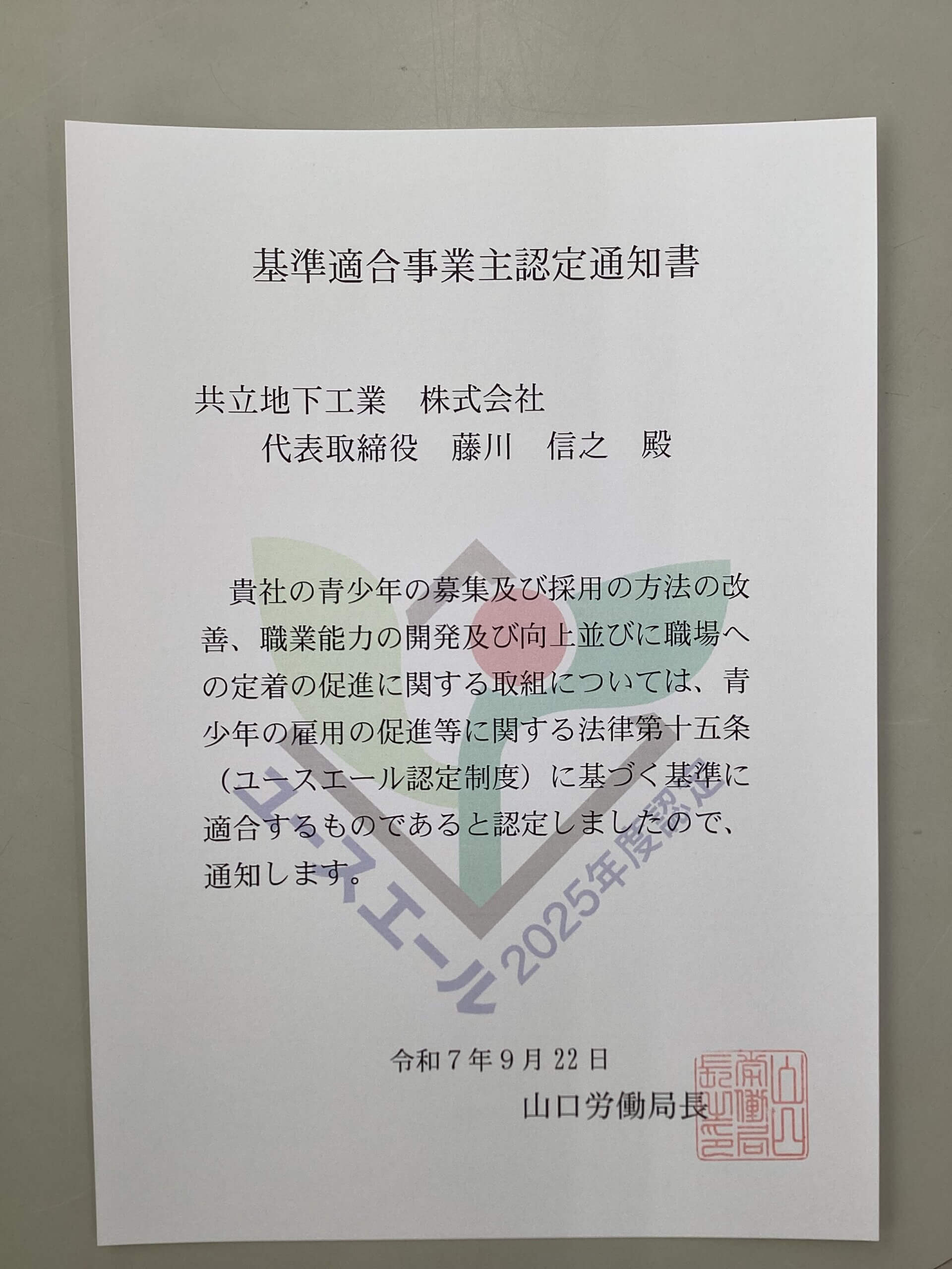 このたび、共立地下工業株式会社は、若者の採用・育成に積極的で、雇用管理の状況が優良な中小企業として、厚生労働省(山口労働局)より「2025年度ユースエール認定企業」として認定されました。