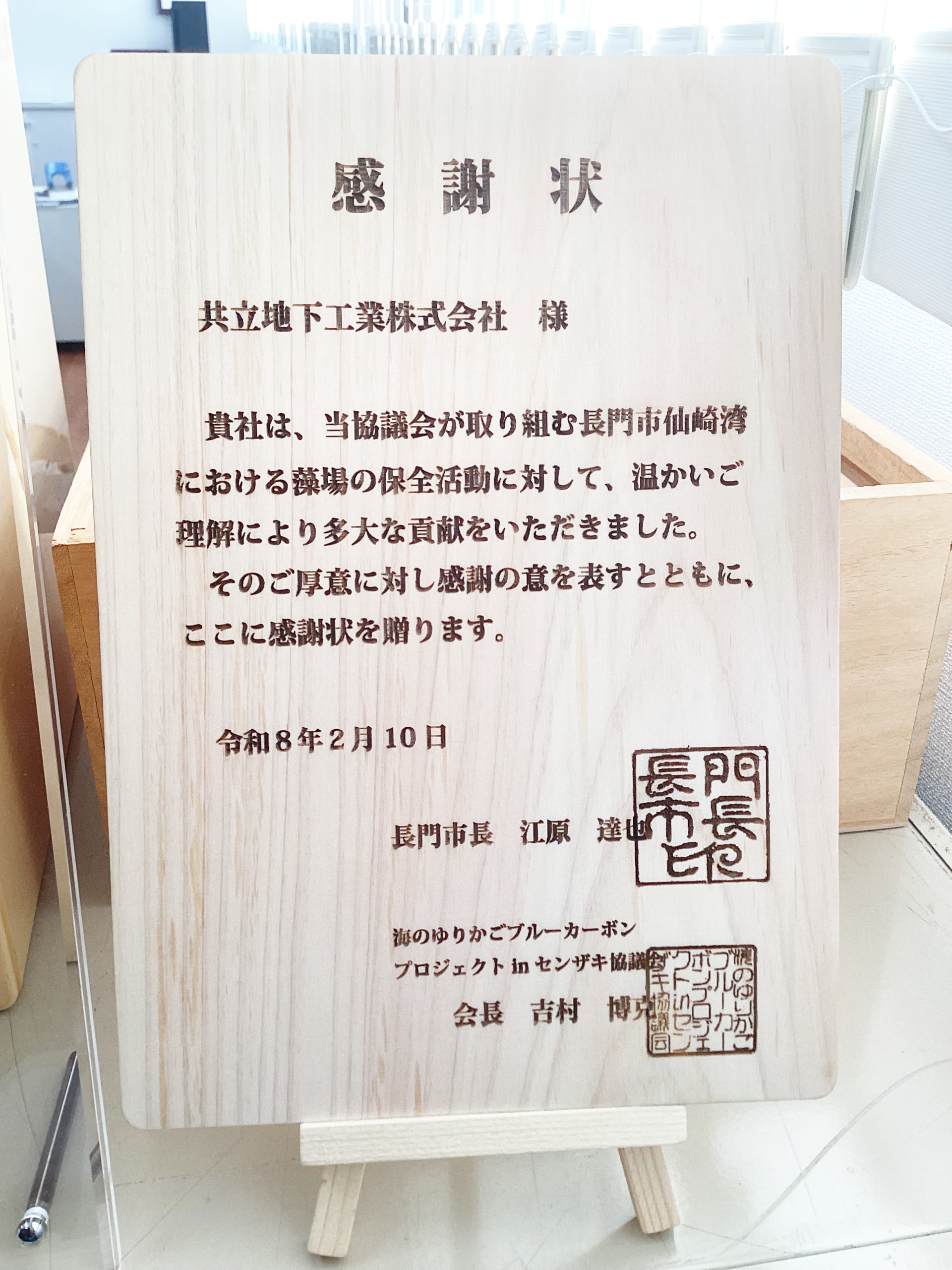 【活動報告】長門市より「ブルーカーボンプロジェクト」の感謝状をいただきました